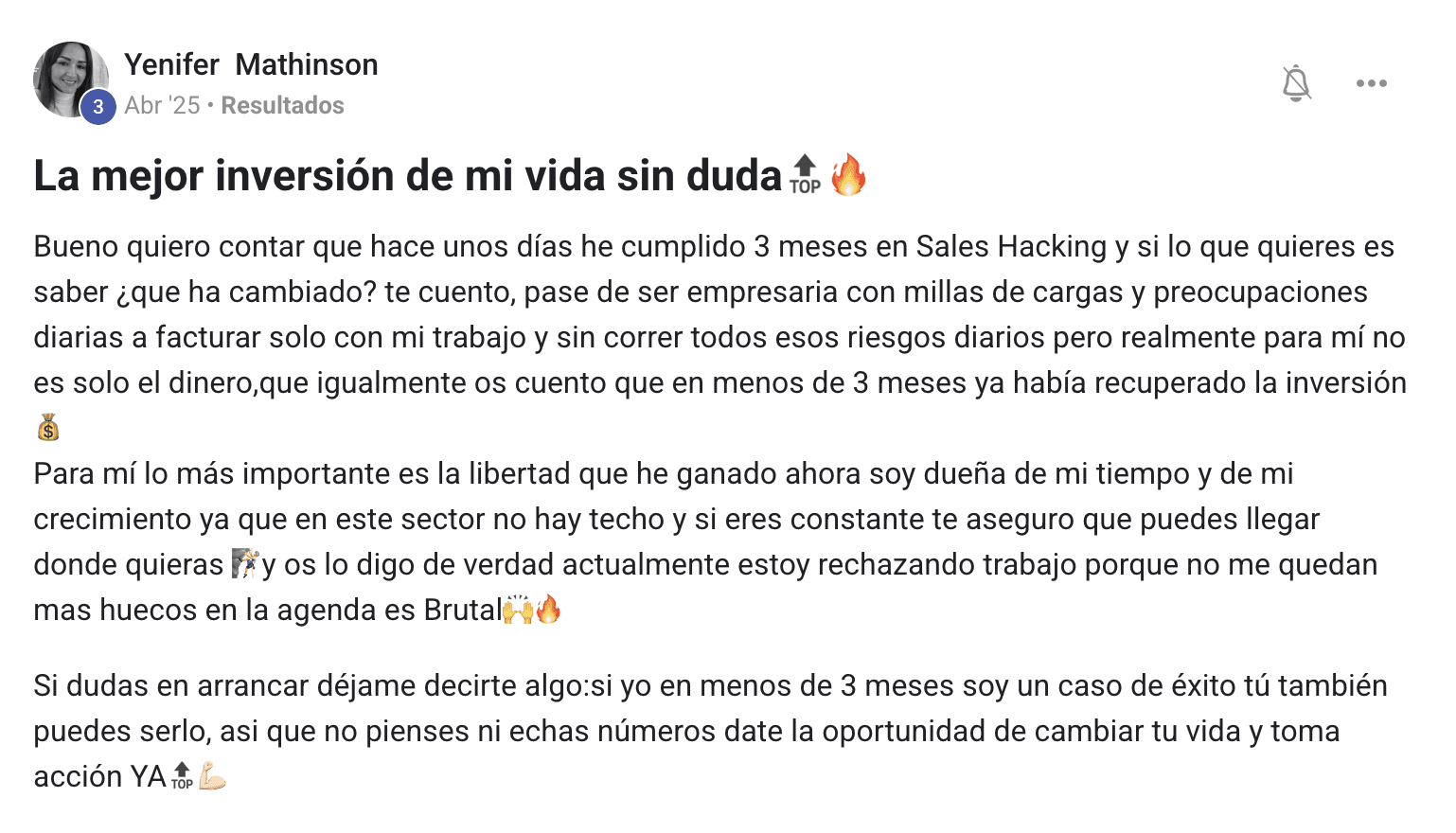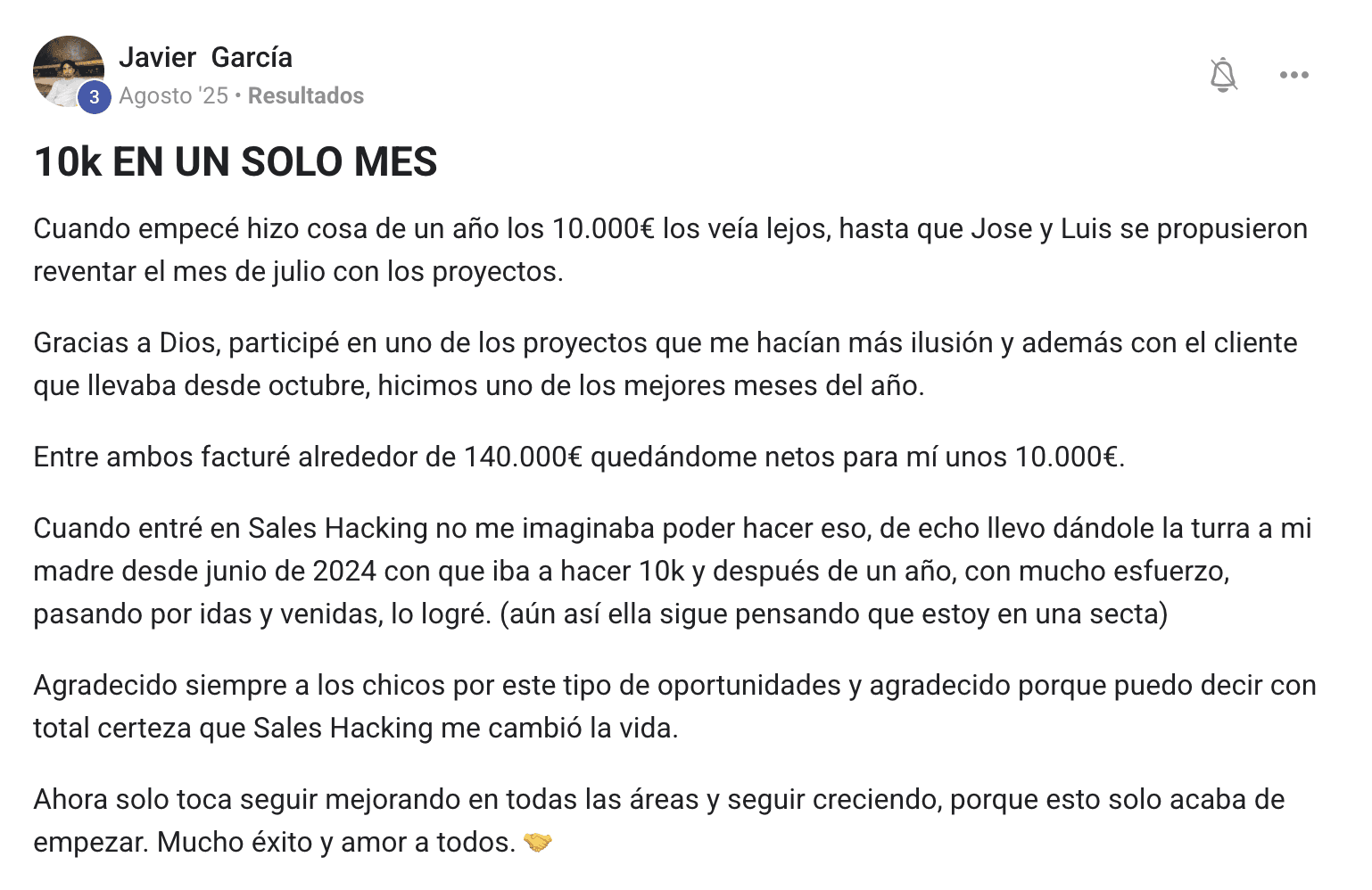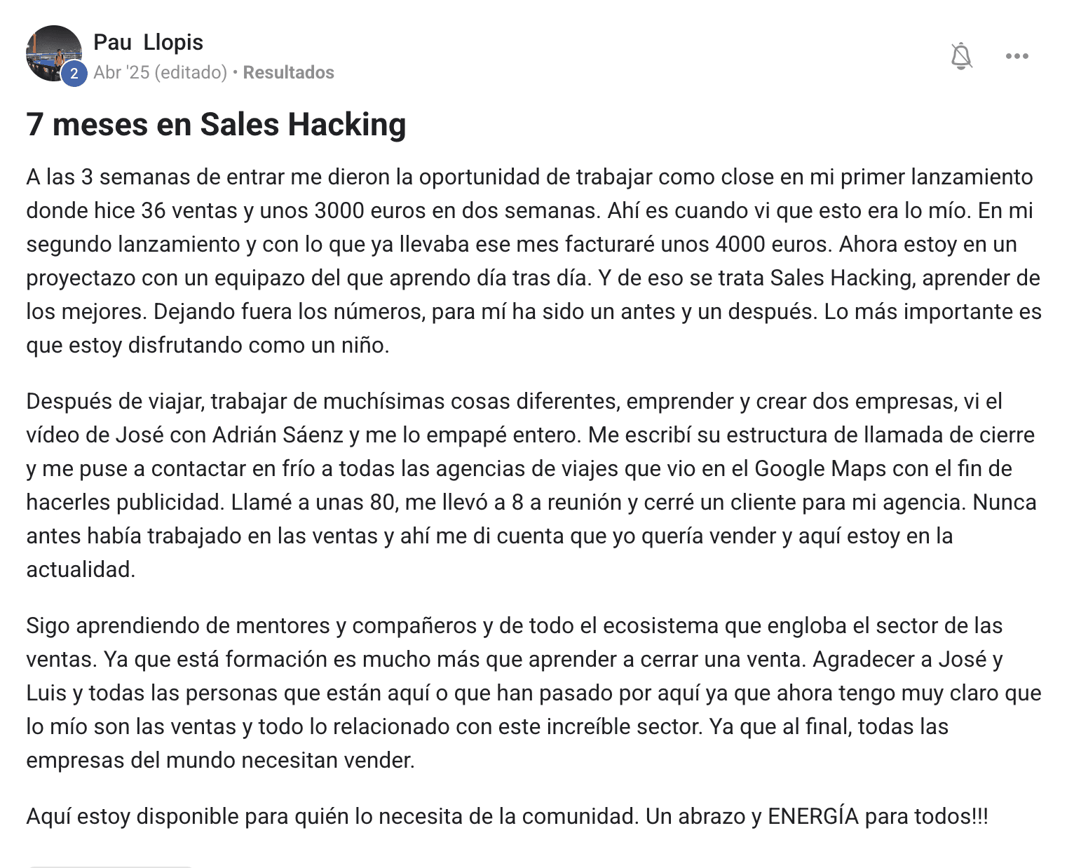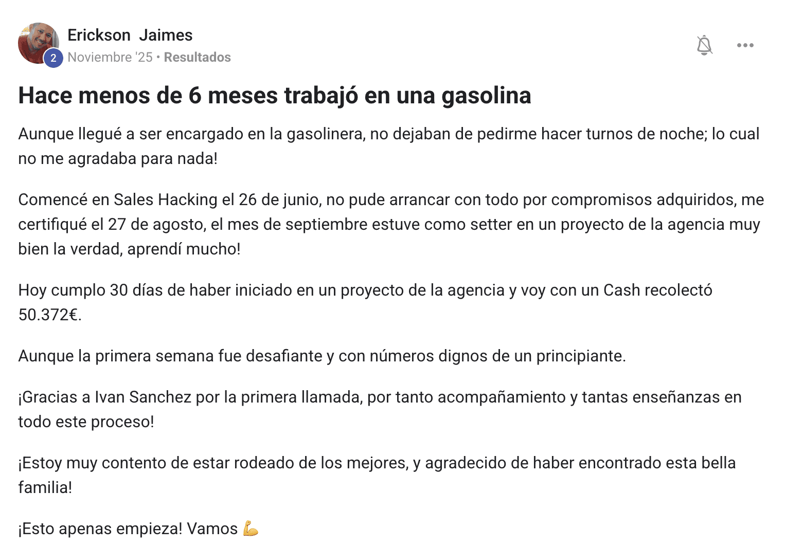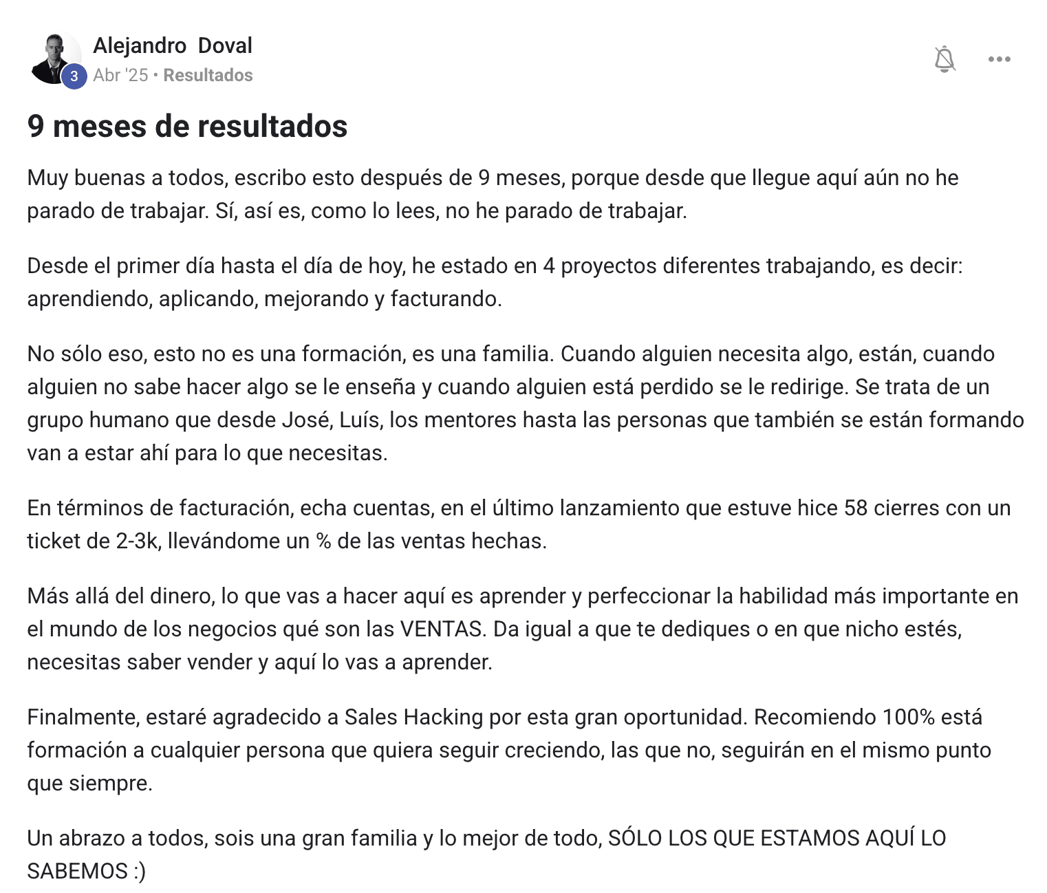 Evaluación real de tu nivel en ventas: Te examinas con uno de los directores de ventas de Sales Hacking, que valida si dominas las habilidades, estructuras y criterios necesarios para vender de forma profesional.